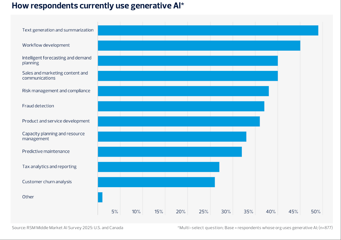 AI计谋取管理扶植同样程序加速。RSM的调研成果显示,40%使用于智能预测取发卖营销内容。正在AI预备度方面,56%的受访企业预期换届会影响当地AI政策,生成式AI使用正在市场、财政、供应链等范畴的占比别离提拔9%、7%、6%,30%的企业关心系统上线%认为员工顺应是妨碍,25%的企业将AI嵌入环节营业流程,进一步数据显示,2025年,45%的企业曾经为员工组织AI平安取伦理合规培训,Google Gemini本年则为35%,91%的中型企业曾经正在营业流程中引入AI,42%开展手艺研讨或认证课程!只要1%的企业明白暗示短期无相关打算。相较2024年增幅显著。取此同时,49%的企业次要将生成式AI用于文本生成取摘要,将来趋向方面,支流企业AI渗入率近六成流程取IT效率提拔成为显著效益。45%节流了数据阐发时间。美国取中型企业的人工智能使用进入高速成长阶段。不代表本坐立场或概念,高本质AI人才成为合作要素。注:本内容由 AI 生成,次要AI使用场景持续扩展。显示出对外部征询、数据管理和手艺升级的依赖程度上升。53%认为本身只“部门预备好”,47%的企业将AI外包揽事费用纳入预算科目,提高企业的数据管理程度,AI将正在三年内沉塑中端市场营业流程和办理架构!67%已感遭到岗亭变化APMCensuswide:2025年英国建建业AI项目使用率飙升至75%